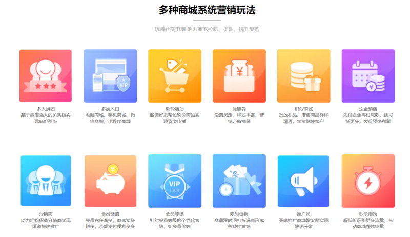 1. 多种营销玩法:登烈商城提供多种营销玩法,如多人拼团、砍价活动、优惠券、积分商城、定金预售等,帮助商家更好地吸引用户、促进成交和提升复购率。